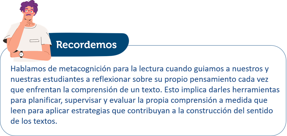 Tal como hemos visto anteriormente, las estrategias metacognitivas nos ayudarán a guiar a las y los estudiantes a desarrollar una lectura estratégica mediante la planificación, supervisión y evaluación de su comprensión.